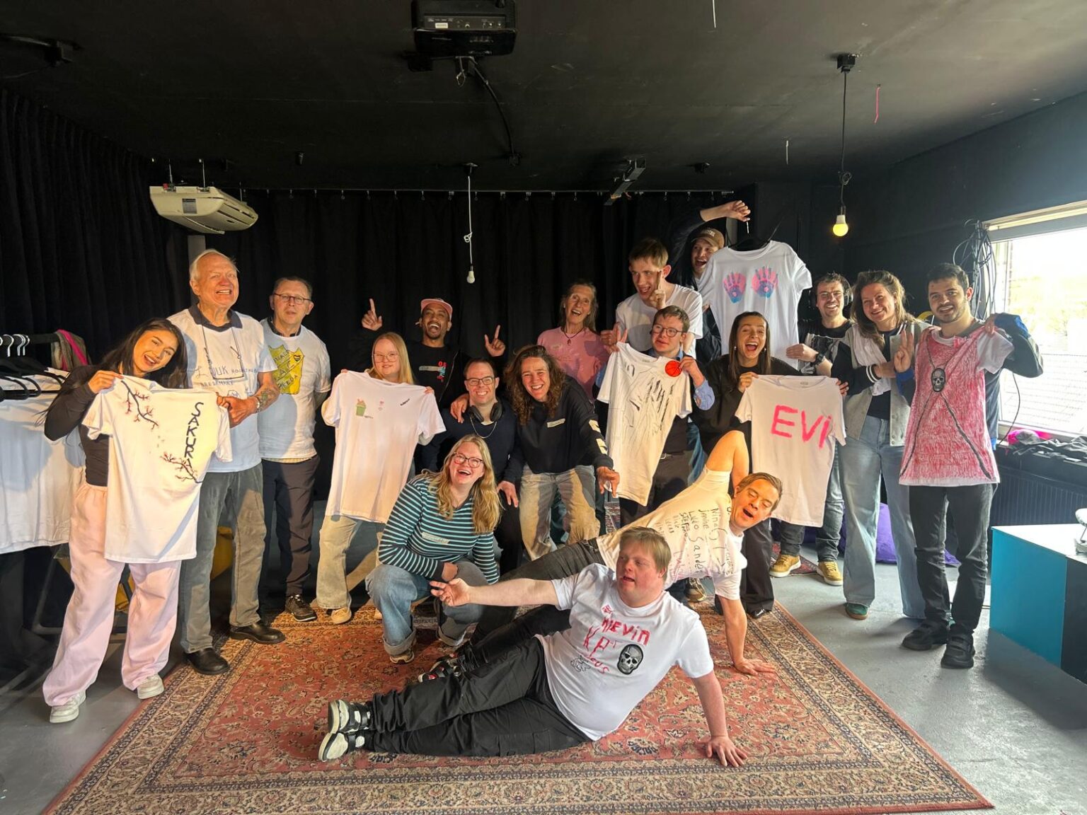 De gezellige groep met hun zelf gemaakte shirts op het kantoor bij Goedzooi!